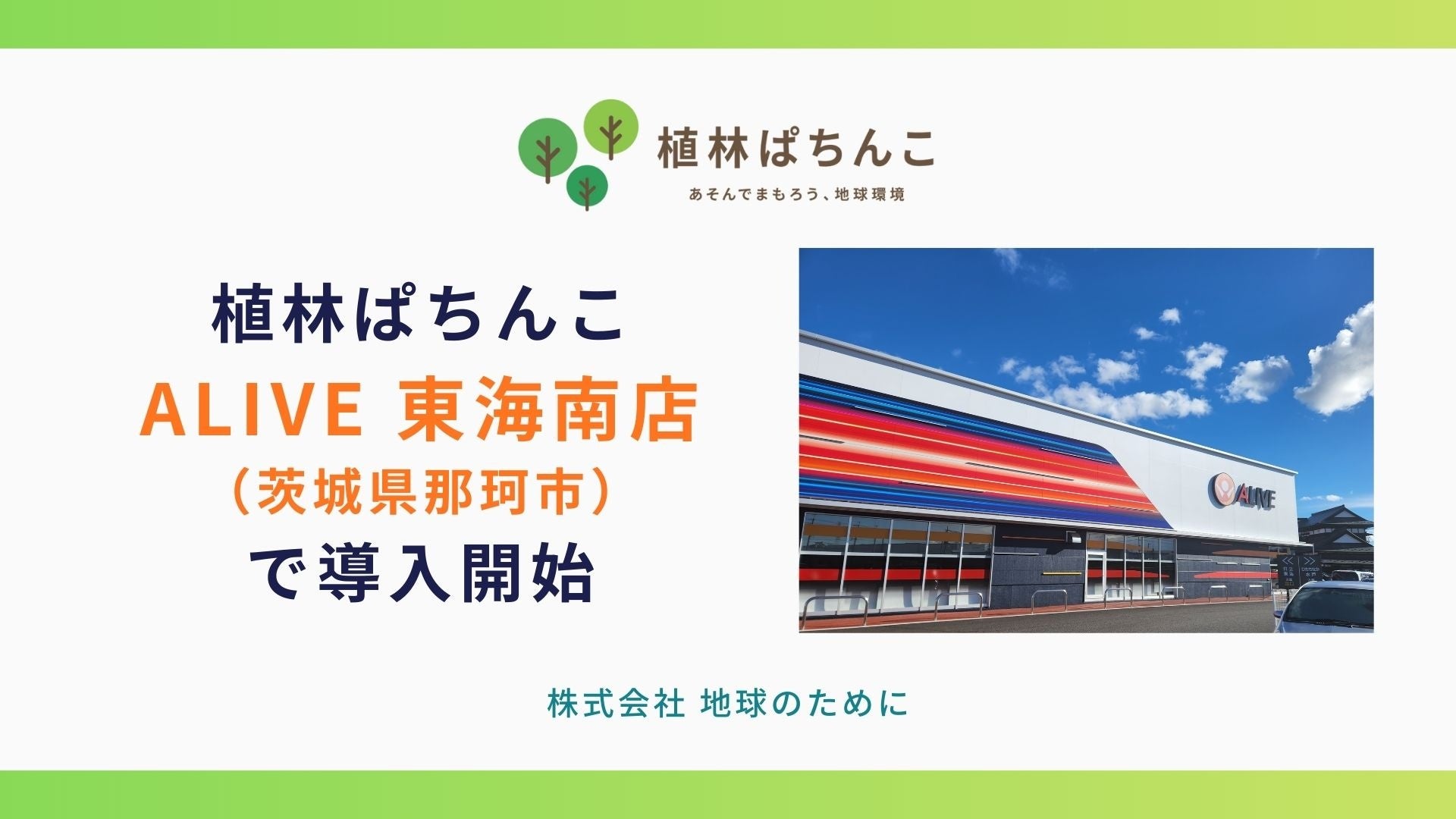 株式会社 地球のために(本社:大阪府大阪市、代表取締役:内藤 勝好)が提供するパチンコホール向けCSR事業「植林ぱちんこ」が、この度株式会社平成興業が開店した新店舗ALIVE 東海南店で導入されました。